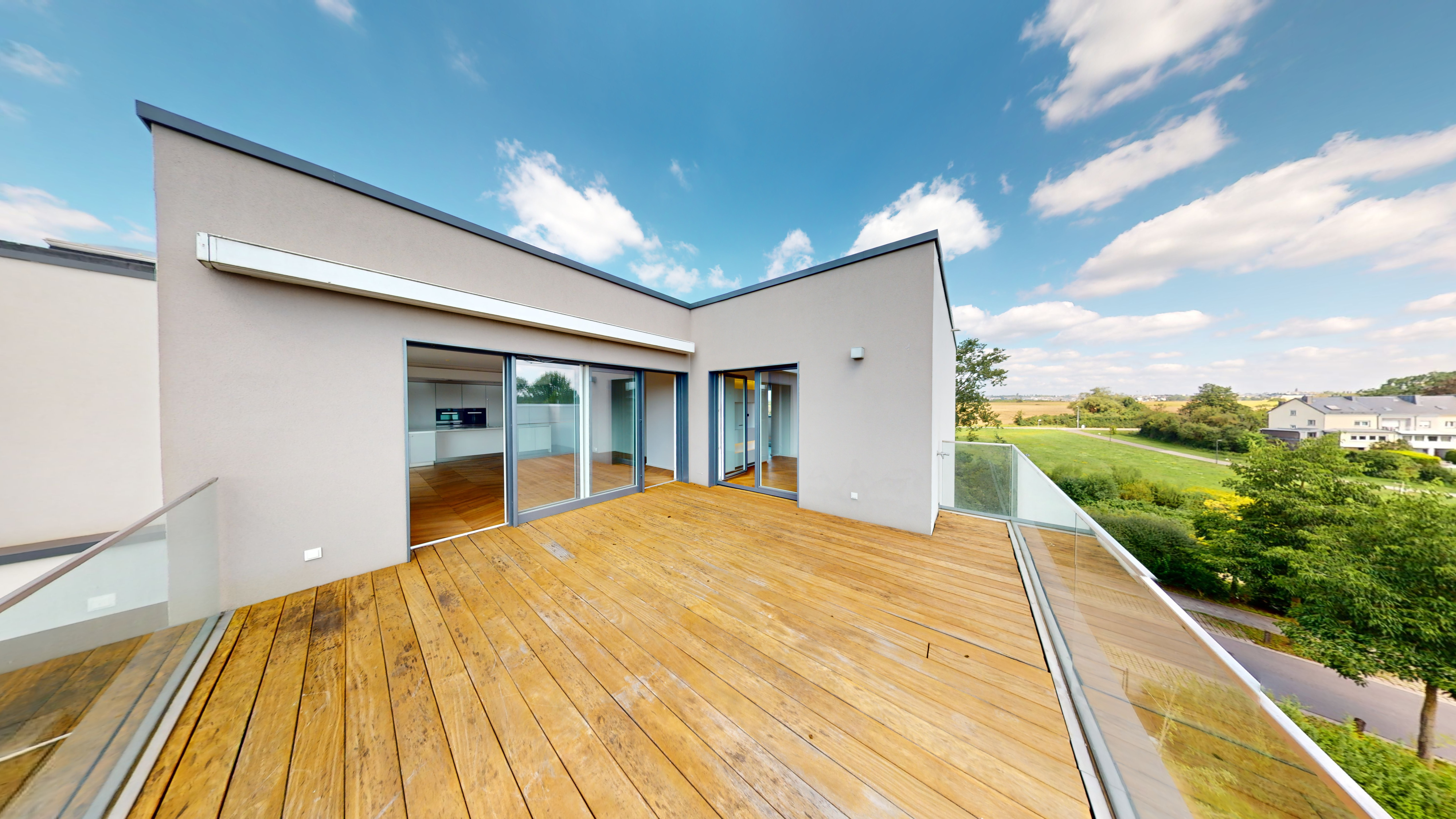 – Eng éischt Terrass vu 25,42 m², südëstlech orientéiert, mat motoriséiertem Bannesstore an duebelen Zougang (Wunnzëmmer an eng Schlofkummer)